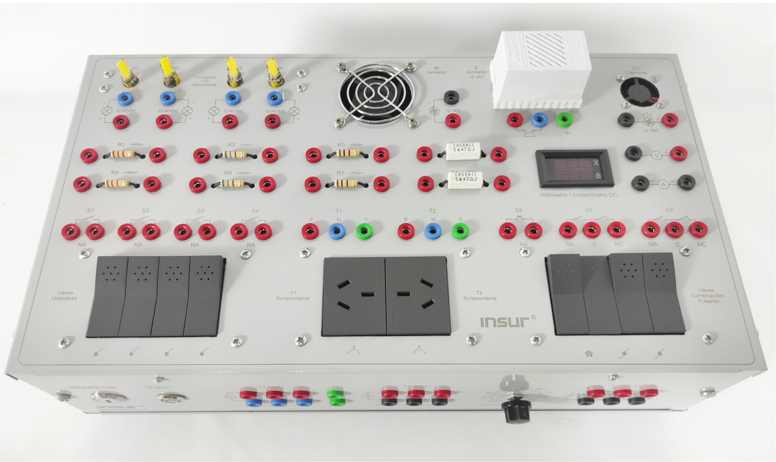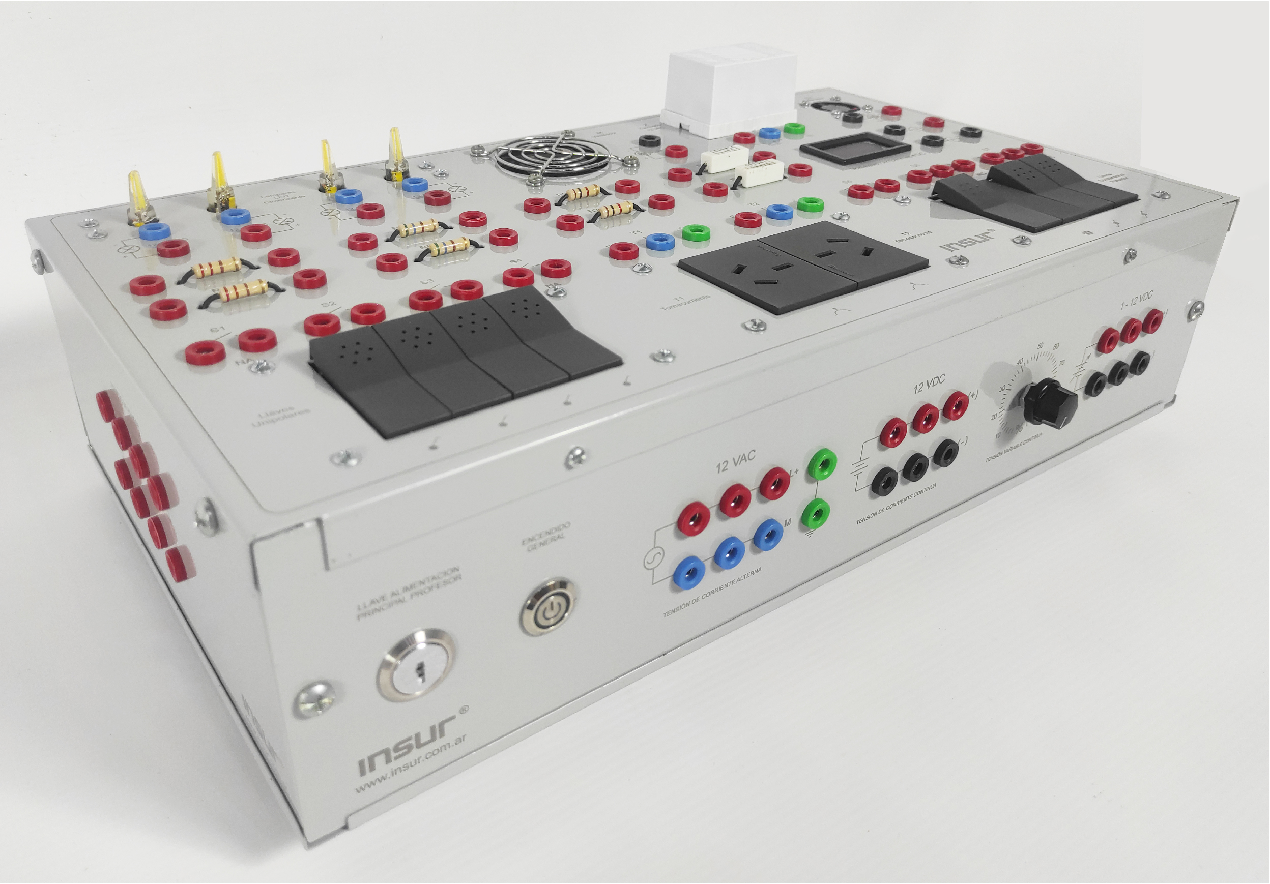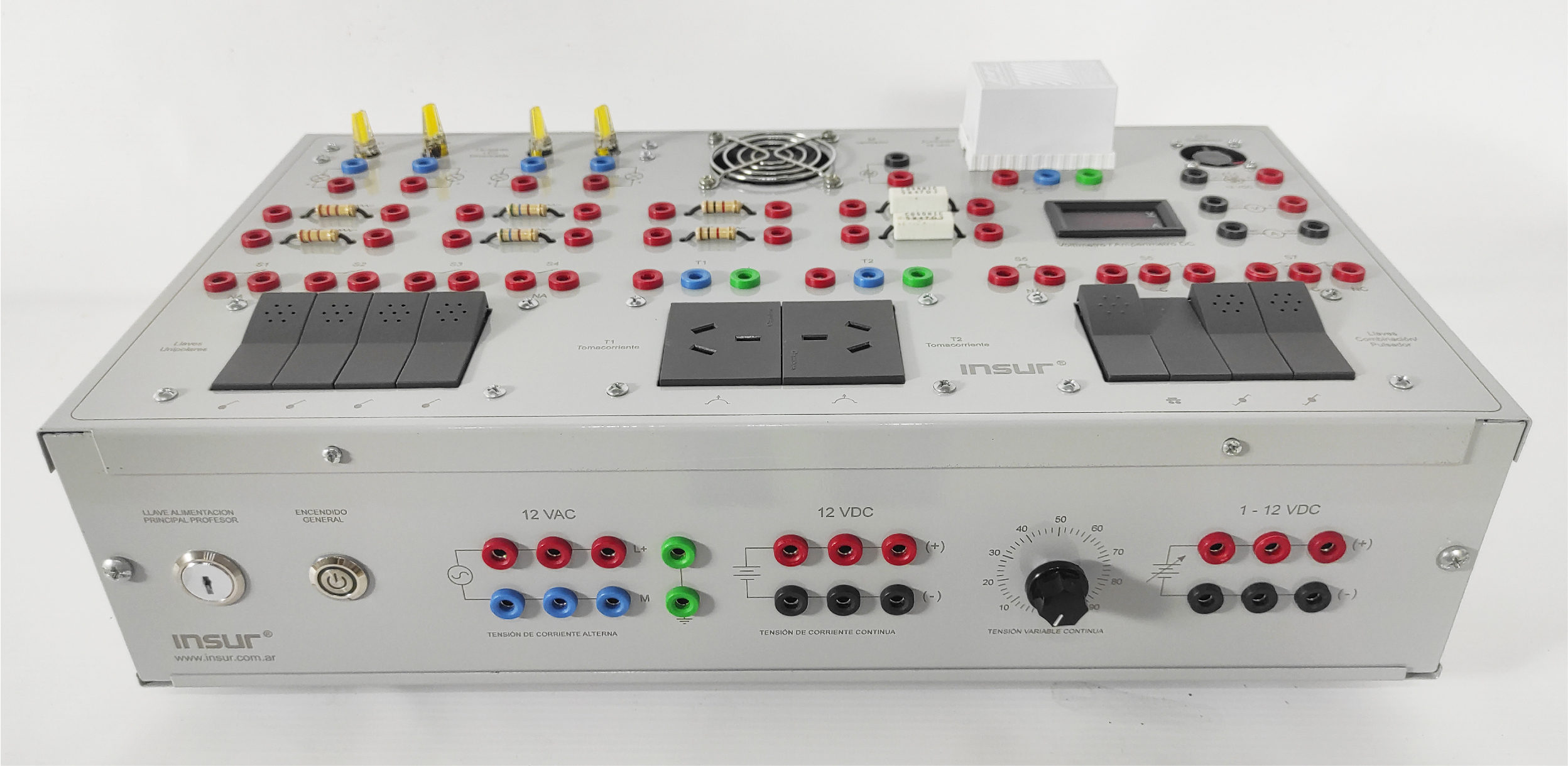 Características eléctricas: Alimentación monofásica 110/220 Volts, 50/60 Hertz, con puesta a tierra. Fuentes de tensión alterna, 12 VAC. Fuente de tensión continua 12 VDC y Fuente de tensión continua variable 1 a 12 VDC.