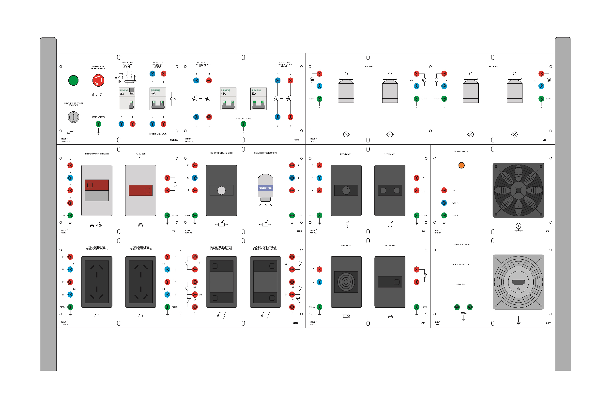 Sistema de bornes experimentales. Para proteger los dispositivos y componentes del tablero, los Módulos Didácticos poseen  bornes de conexión  rápida, de cabeza imperdible, construcción robusta y excelente terminación.