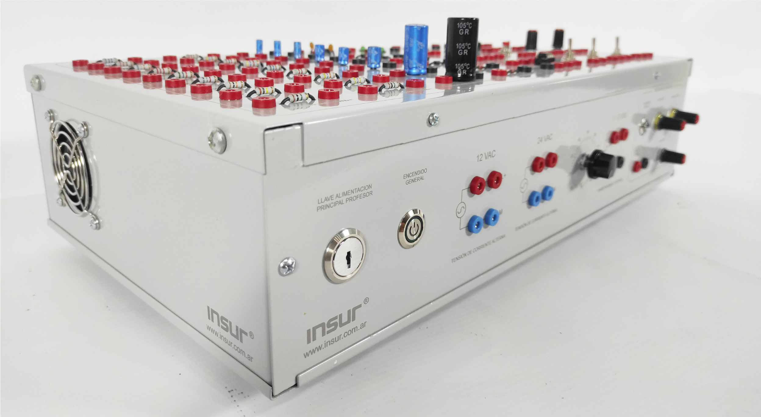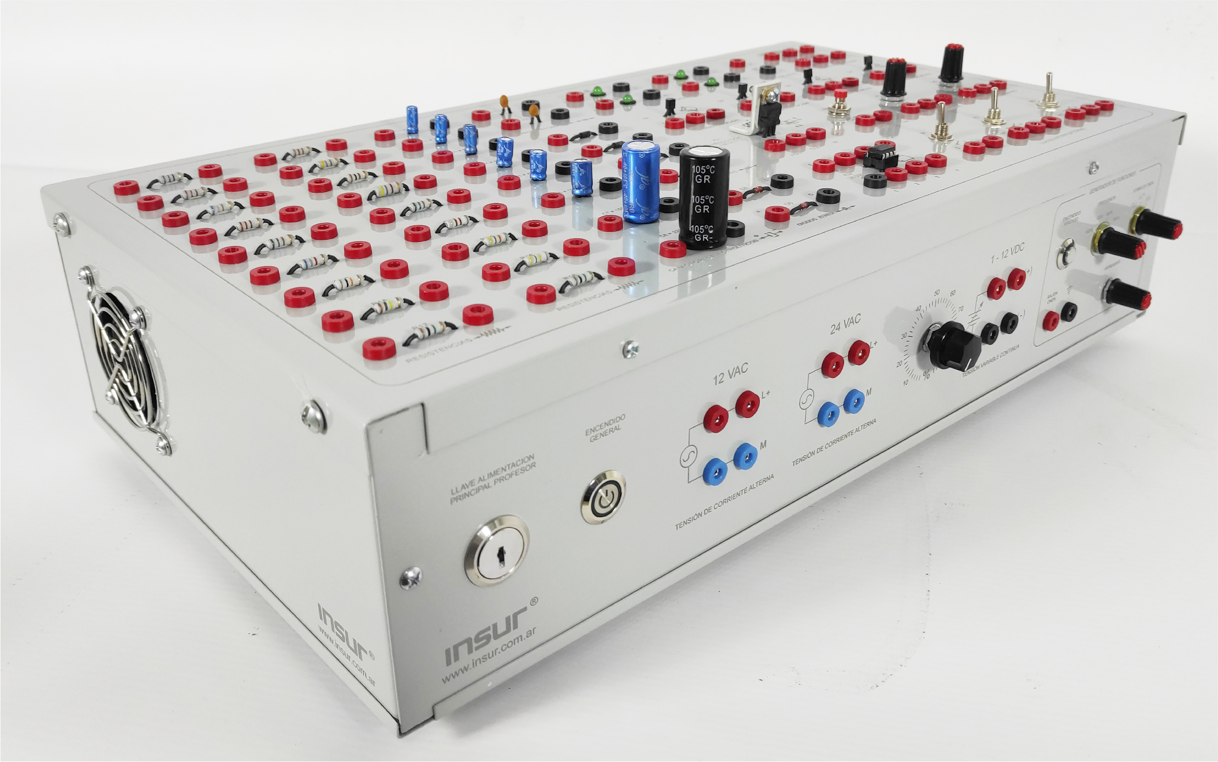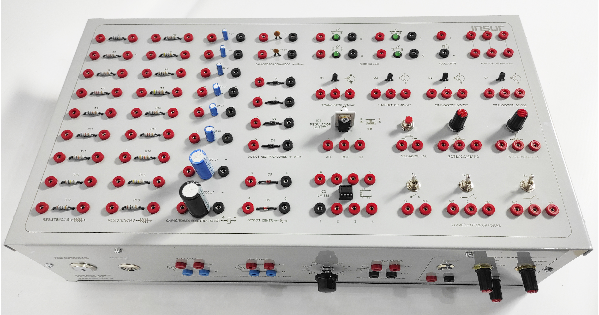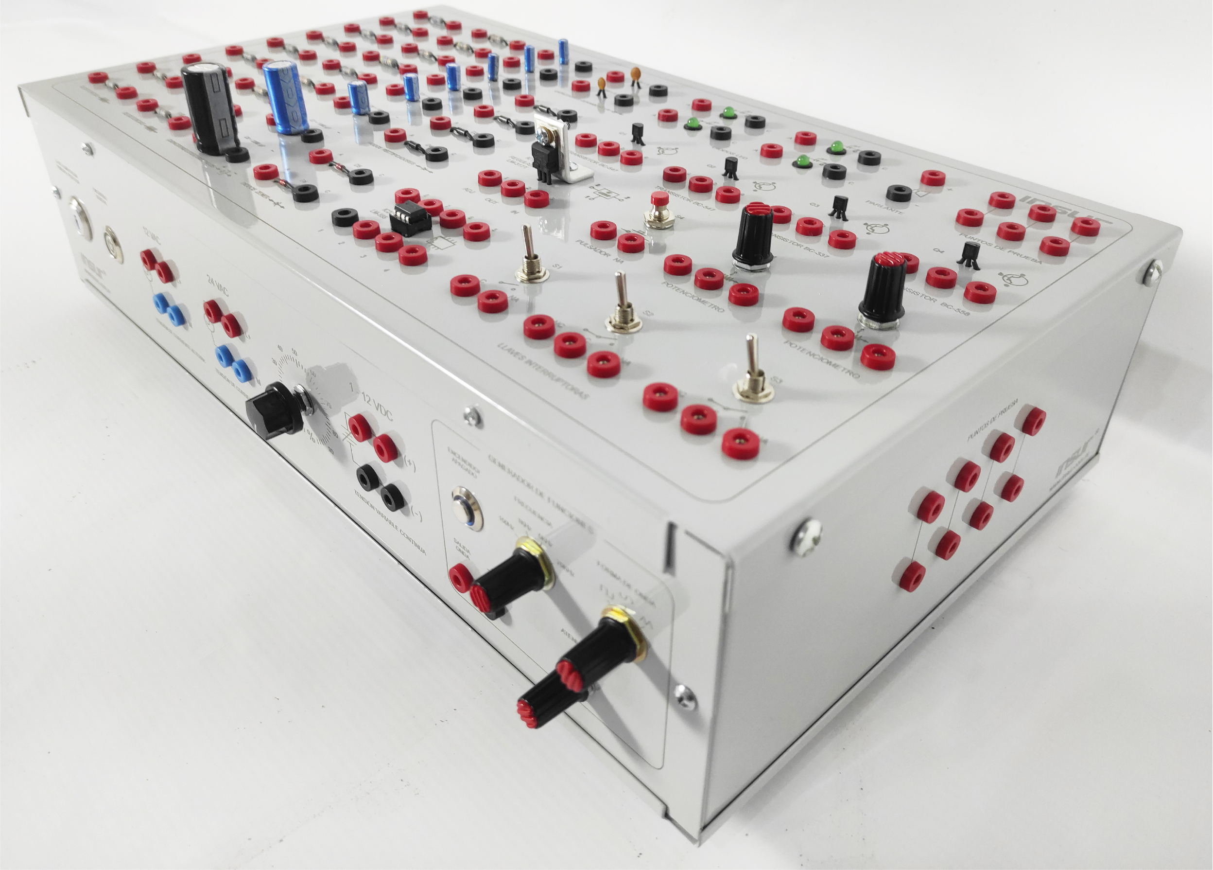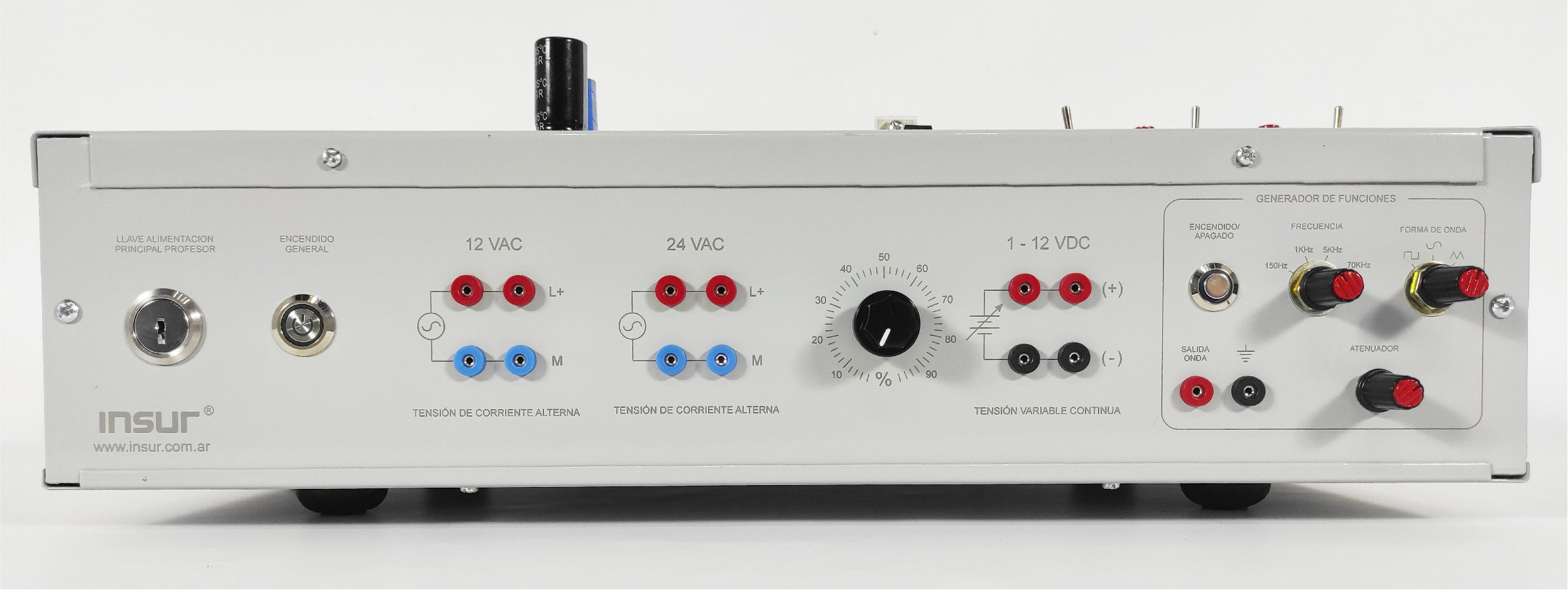 Características eléctricas: alimentación monofásica 110/220 Volts , 50/60 Hertz , con puesta a tierra. Fuente de tensión alterna, 12 y 24 VAC. Fuente de tensión continua variable 1 a 12 VDC